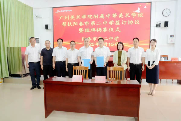 2025 年 7 月 15 日,盛夏时节,广州美术学院附中党总支书记温清浩、校长胡宇一行奔赴阳春市第二中学,共同签署帮扶共建协议,并为 “广东省双百行动--广州美术学院附属中等美术学校教学共建实践基地” 挂牌揭幕。阳春市副市长蓝瑜亲临现场并致辞。广州美术学院“双百行动”办公室组织员崔栩、阳春市人民政府办公室副主任成媛媛、阳春市教育局相关领导、阳春二中校领导和部分教师代表以及我校专业帮扶组组长李树信一同出席了活动。